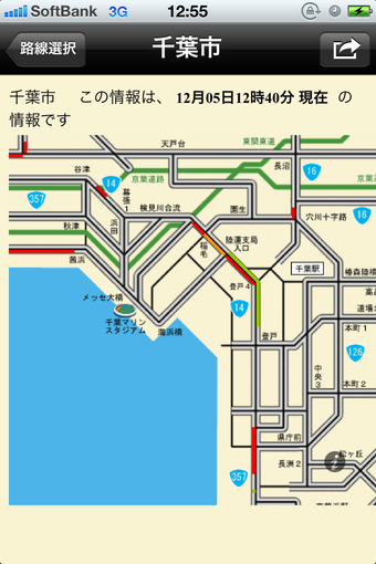 渋滞ナビでは5分ごとに情報を更新し、「最新情報」として15分前の時点の情報を表示します。表示は路線図と渋滞箇所などを色で示した地図表示のほか、道路規制やかかる時間などの文字情報表示でも行えます。またメニューキーからメールで渋滞マップを送ったり、JARTICサイトから追加情報を入手することも可能です。